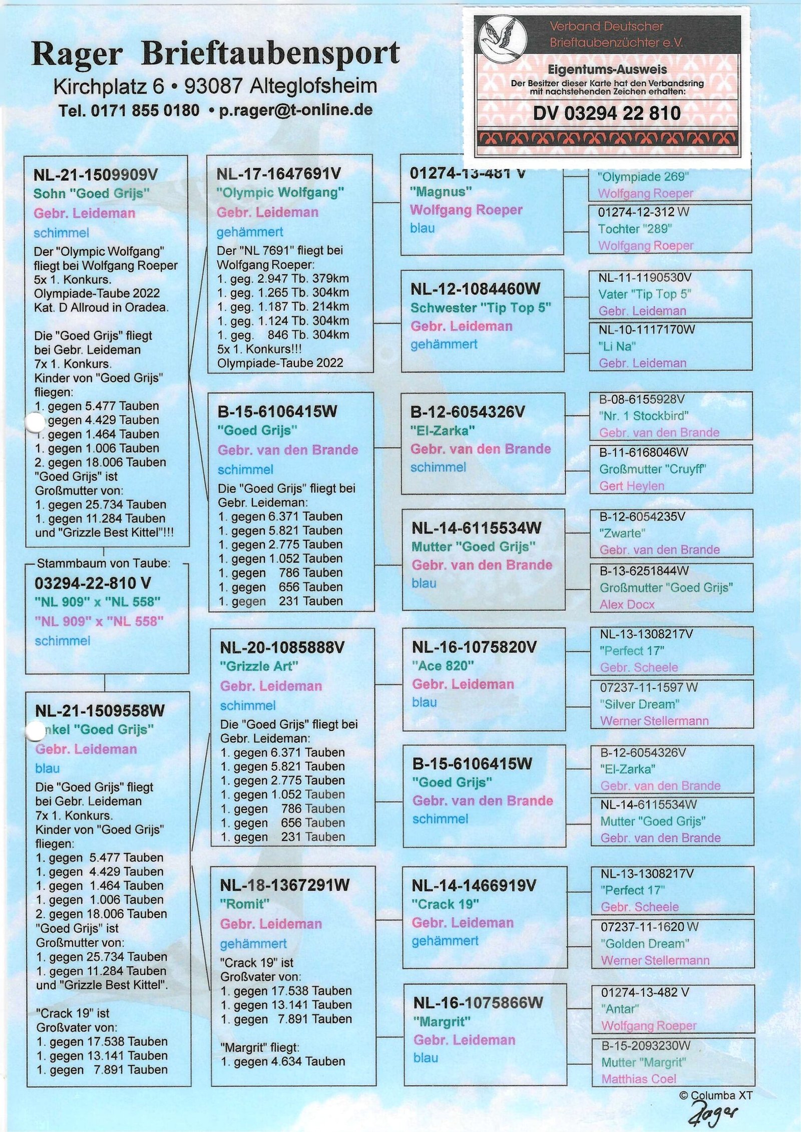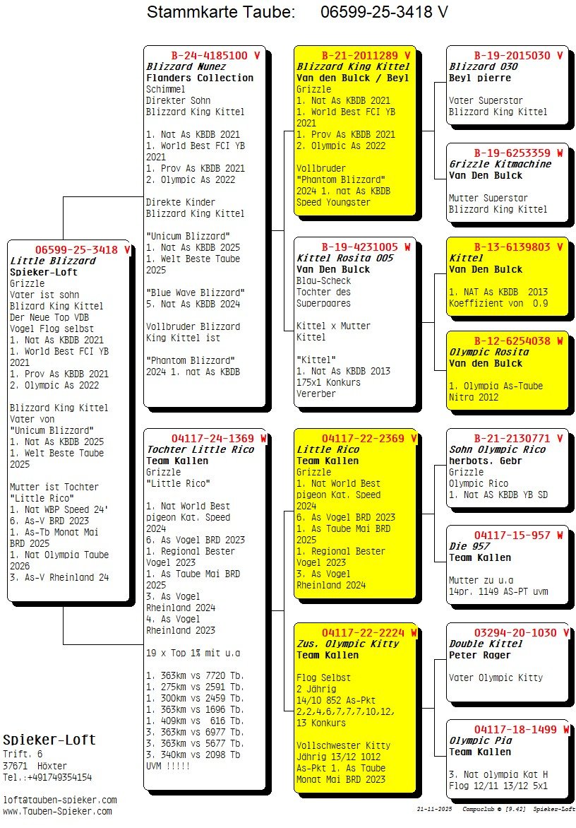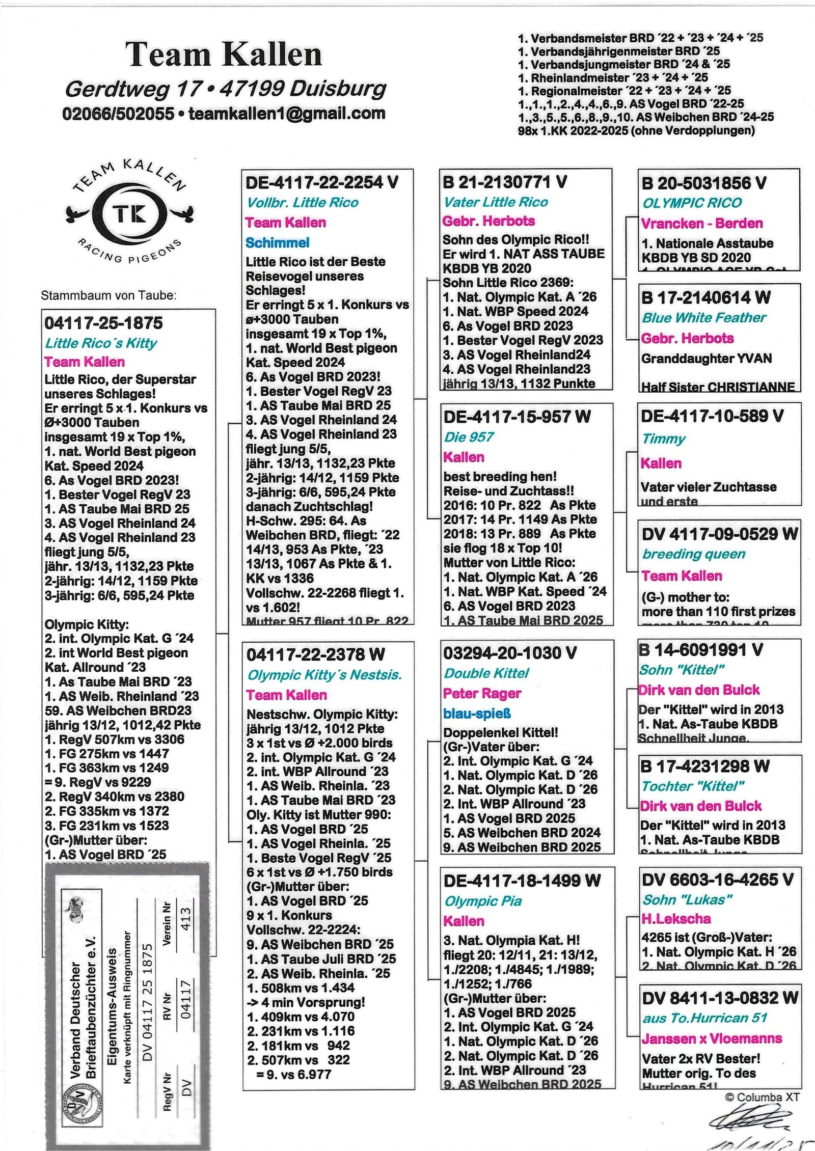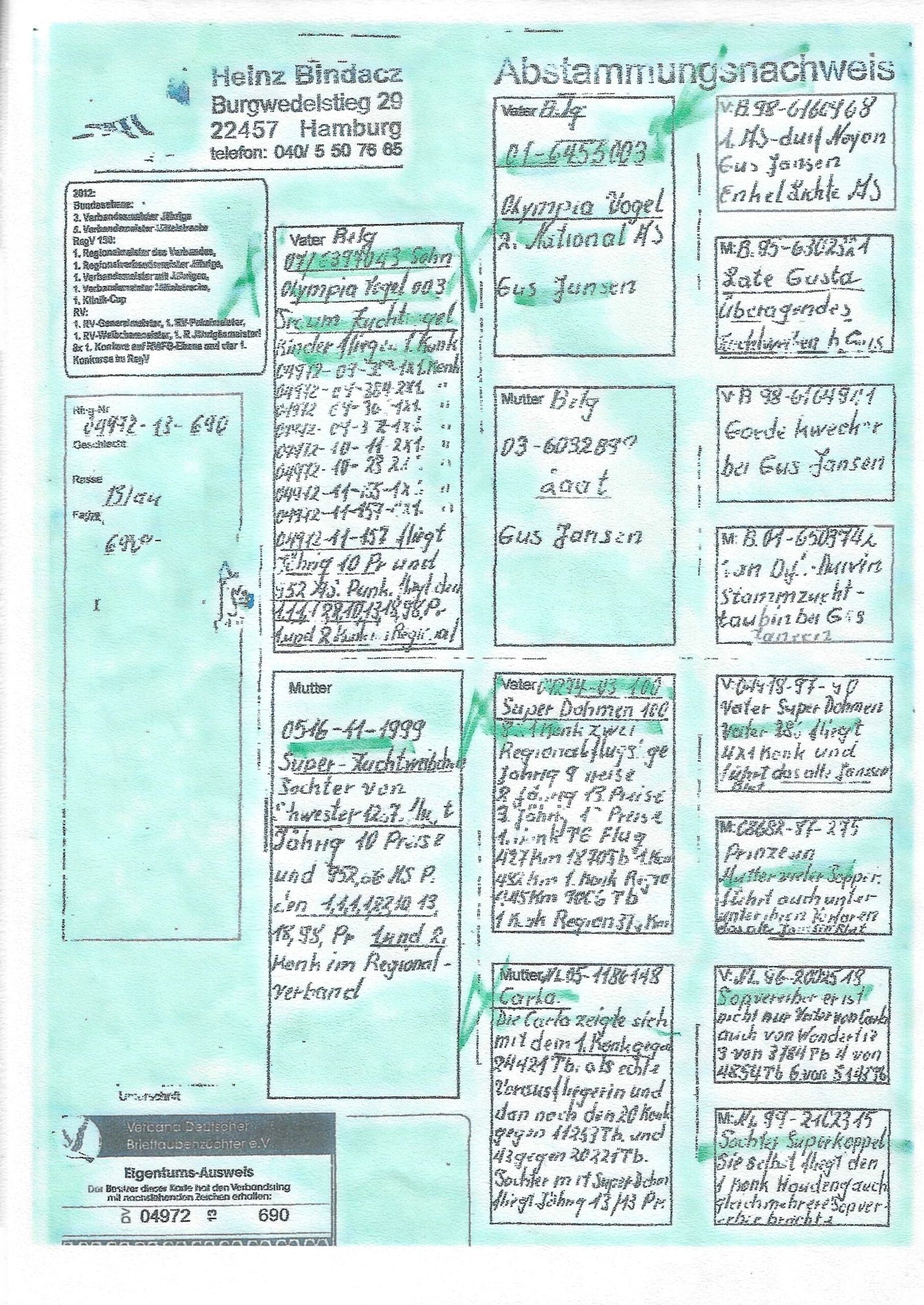 Zucht-Vögel B-24-4185100„Sohn Blizzard King Kittel“AbstammungB-23-4181680„So. Victory BK“AbstammungB-22-2124344„Sohn Olympic Rico“Abstammung08600-23-345„Sohn Grizzle“AbstammungNL-21-1752366„Sohn Connor“Abstammung03294-22-810„Enkel Goed Grijs“Abstammung07854-16-506„4 As-V Westfalens“AbstammungB-23-3016434„Blizzard 434“AbstammungB-21-6049495„Capo“AbstammungB-21-2140211„Sohn Olympic Rico“Abstammung04117-25-1906„Halb Br. Little Rico“AbstammungB-21-6208992„Enkel Porsche 911“Abstammung05808-23-5„Sohn Joker“AbstammungB-19-5010175„Sohn Br. Whiteman“Abstammung04972-13-690„Sohn B-043“Abstammung01777-20-740„Sohn Dirk“AbstammungB-20-6033106„Enkel Pitbull“AbstammungPT-21-1265001„Enkel BK“Abstammung06599-25-3418„Little Blizzard“Abstammung02884-22-167„Enkel Finn Teske“AbstammungNL-20-1179137„Sohn Diamonds Girl“AbstammungCRO-24-910„So. Nestbr Goed Grijs“AbstammungB-17-2140561„Sohn Yvan“Abstammung04117-25-1875„So. Br. Little Rico“Abstammung06599-25-3299„Enkel Blizzard“Abstammung